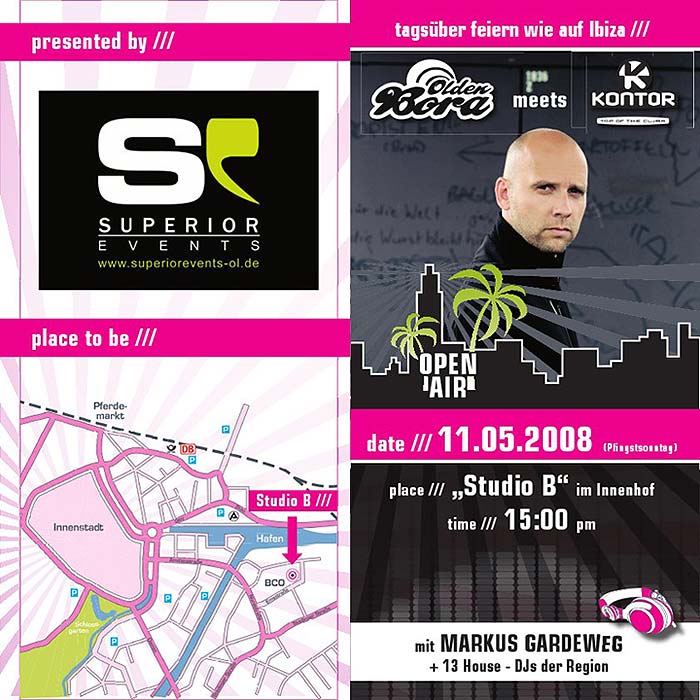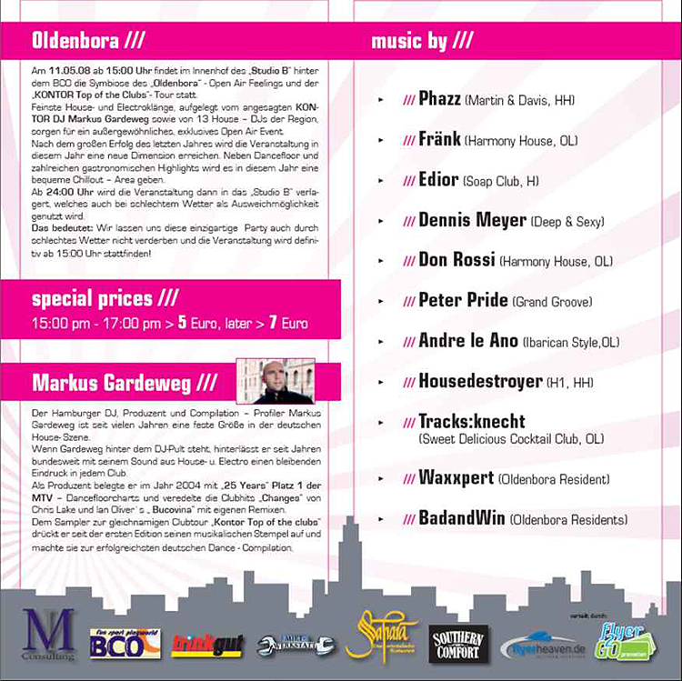 Am 11.05.2008 findet im Innenhof des Studio B. hinter dem BCO die Symbiose des Oldenbora - Open Air Feelings und der Kontor Top of the Clubs - Tour statt.