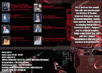 Paul Elstak&Mc Ruffian (Back2School), Mystery (P.T.P/Sonicbangers), Paraghandy (P.T.P/Sonicbangers), E-Light (P.T.P/Sonicbangers), Sonicbangers (HHF), Shalien (Berks-Resident), Mc Tazz (Sonicbangers), Mc'Da'Hardconnector