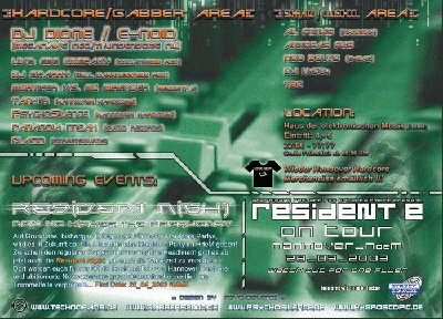 Hardcore Area: DJ Dione aka. E-Noid(Megarave Records/ D.N.A./Thunderdome/NL), Live: EBE Company(Ebe Company Records/Goliath), DJ Sparky(Ebe Company Records/Well Darkness), DJ Mortifer vs. MC Mirender(Resident E/Hannover Hardcore), Tank*R(Hannover Hardcore/Tenne), PsychoSilence(Hannover Hardcore/technofans.de), DJ Placid(Streetsounds), Paranoia Freak(Suizid Records/PM-Satis) - Techno/Schranz/Oldschool Area: Al Fonks(Reincarnation Parade/Ganesha), Rod Bolts(E-Mag/Resident E), H2SO4, TBC