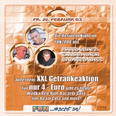 Wo Resident-Night draufsteht, da ist auch Resident-Night drin. Gleich alle drei FUN 2000 Residents werden heute den Dance-Freaks kräftig einheizen. Mario Lopez, Rico Bass und William Hawk besorgen es euch heute Abend wieder mal besonders lange. Residentpower bis in die frühen Morgenstunden. Und damit das auch lang genug klappt, gibt es für nur 4 € die XXL Getränke-Specials mit Wodka-Red Bull, Bacardi-Cola, Jim-Beam Cola and many many more!
