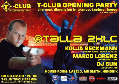 Zur Eröffnung des T-Clubs ist kein geringerer als der aus Frankfurt am Main stammende Techno-Gott Talla 2 XLC (Technoclub, Trance Allstars, Bostrich Club FFM) an den Drehern. Als einer der international meist gebuchten DJs ist es uns eine besondere Ehre, ihn zur feierlichen Einweihung des T-CLUBs begrüßen zu dürfen. Lokal Support geben niemand geringerer als der Initiator der Vision Parade DJ Kolja Beckmann und Bremens beliebter Trance DJ Marco Lorenz aka HighTower (TranceMotion). Talla 2 XLC setzt den fulminanten Auftakt in einer Reihe internationaler TOP Djs im neuen T-CLUB. Jedes 2. Wochenende im Monat präsentiert Euch der T-CLUB verschiedene Top-Acts mit Support der Local DJs in absolut clubbiger Atmosphäre.